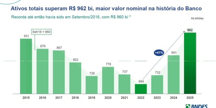 ATIVOS – Os ativos totais do Sistema BNDES somaram R$ 962,5 bilhões em 31 de dezembro de 2025, maior valor nominal na história do Banco, com aumento de R$ 121,6 bilhões (14,5%) em relação a dezembro de 2024, sobretudo pelo crescimento de R$ 78,6 bilhões da carteira de crédito expandida, de R$ 40,9 bilhões em Tesouraria, especialmente títulos públicos, e de R$ 4,4 bilhões da carteira de participações societárias. Em relação a 2022, o aumento foi de 41%.