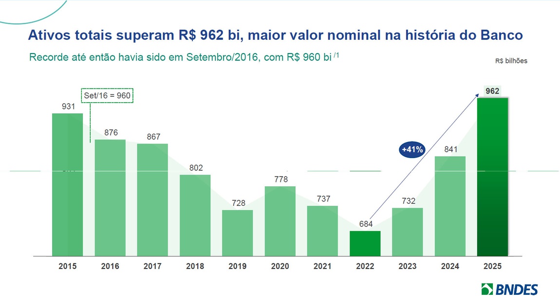 O Banco Nacional de Desenvolvimento Econômico e Social (BNDES) registrou em 2025 o maior lucro recorrente da história da instituição, com R$ 15,2 bilhões, resultado 15,4% superior a 2024. O Banco encerrou o ano com recorde na injeção de crédito, totalizando R$ 366 bilhões, alta de 32% em relação a 2024, maior valor nominal da história em ativos totais (R$ 962 bilhões), carteira de crédito (R$ 664 bilhões) no maior patamar desde 2016, caixa livre quadruplicado (R$ 61 bilhões) em relação a 2022 e maior patamar histórico do Patrimônio Líquido (R$ 172 bilhões).
