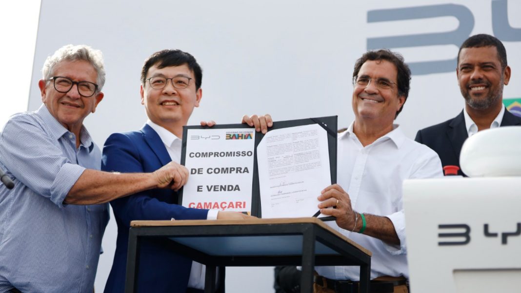 O governador Jerônimo Rodrigues e os secretários estaduais da Fazenda (Sefaz) e de Desenvolvimento Econômico (SDE), Manoel Vitório e Ângelo Almeida, respectivamente, participaram da cerimônia e assinaram contrato de compra e venda do imóvel, pertencente ao Estado, que concederá, a partir da data, o uso da área pela fabricante. Na celebração também estiveram presentes o presidente da BYD Brasil, Tyler Li e Alexandre Baldy, conselheiro especial da companhia